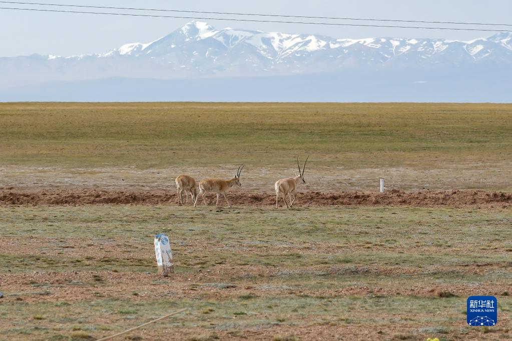 6月15日,几只藏羚羊缓步走向白雪覆盖的昆仑山方向。