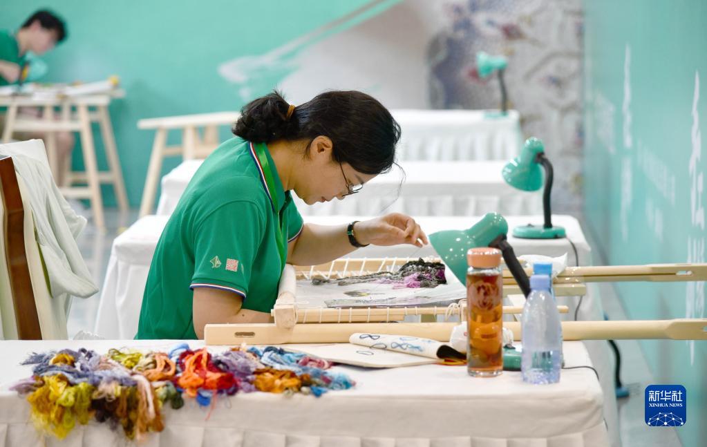7月3日,在第一届全国农民技能大赛上,选手参加手工刺绣项目比赛。