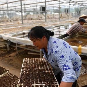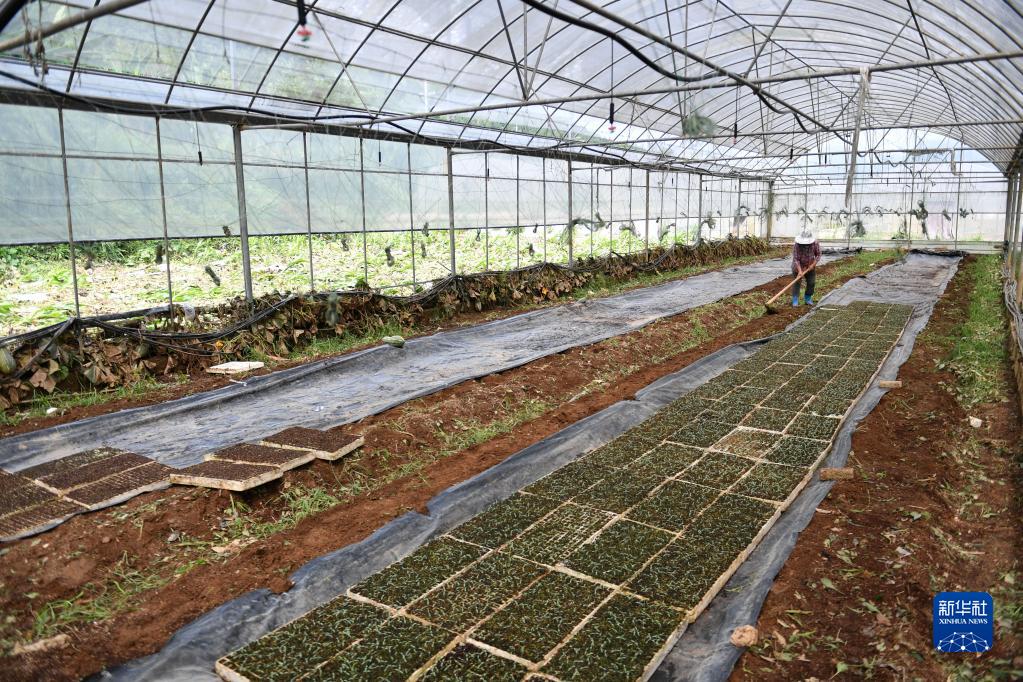 7月3日,在湖南湘西州保靖县阳朝乡溪洲村一处农业基地,农民在打理蔬菜苗。