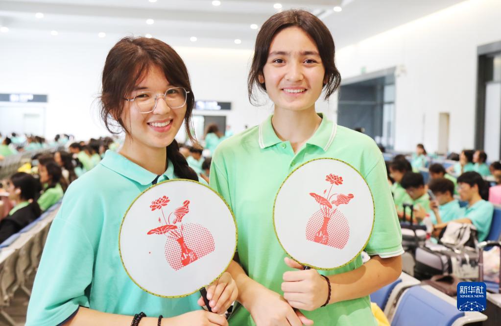 7月3日,“内高班”学生在苏州火车站展示候车时制作的团扇。