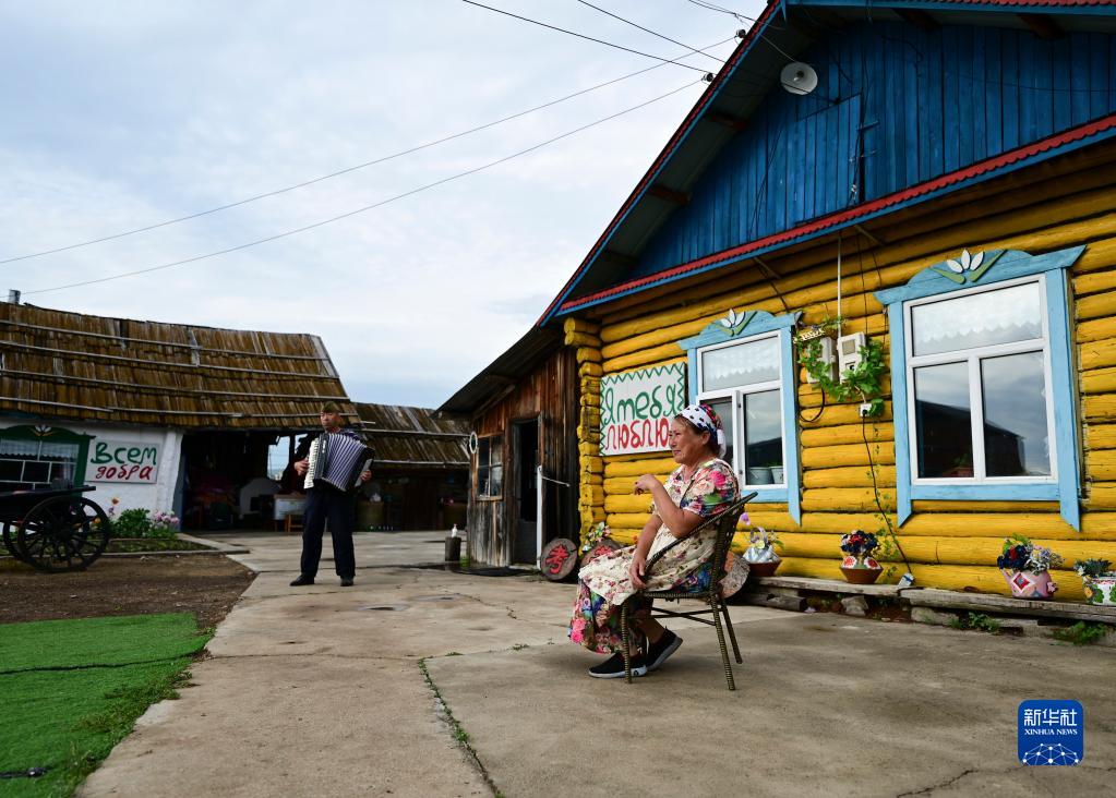 6月28日,考占花(右)坐在庭院里,萨沙在拉手风琴。考占花是萨沙的嫂子。