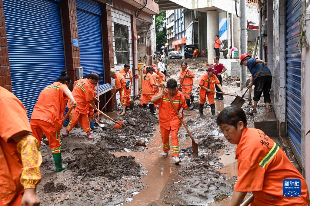 7月4日,重庆万州区五桥街道,积水退去后环卫工人进行清理作业。