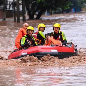 7月4日,在重庆市万州区五桥街道,武警重庆总队船艇支队官兵在转移受困群众。