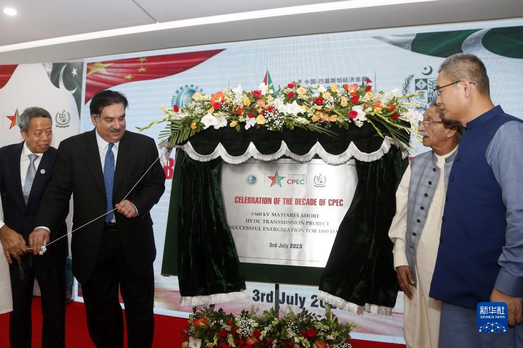 7月3日,在巴基斯坦拉合尔,巴基斯坦电力部长胡拉姆·达斯特吉尔汗(左二)出席“默蒂亚里-拉合尔(默拉)直流输电项目庆祝中巴经济走廊启动十周年暨项目成功带电运行1000天”仪式。