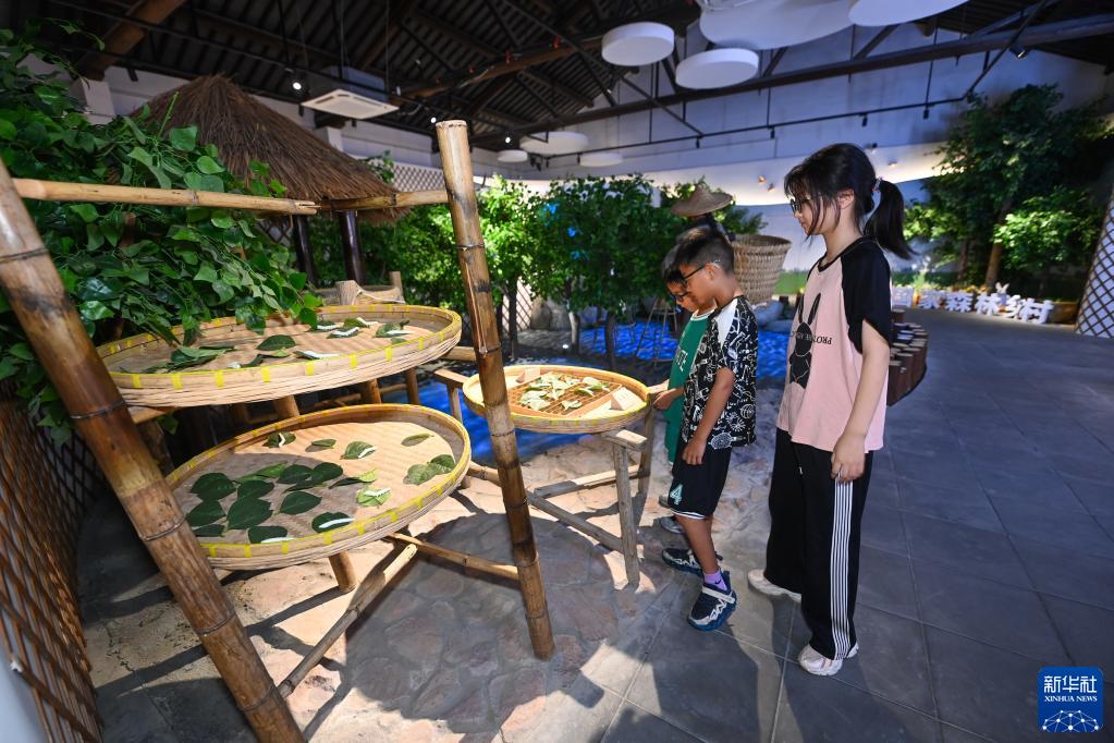 7月5日,孩子们正在参观织里镇伍浦村文化礼堂内的蚕桑文化展示。