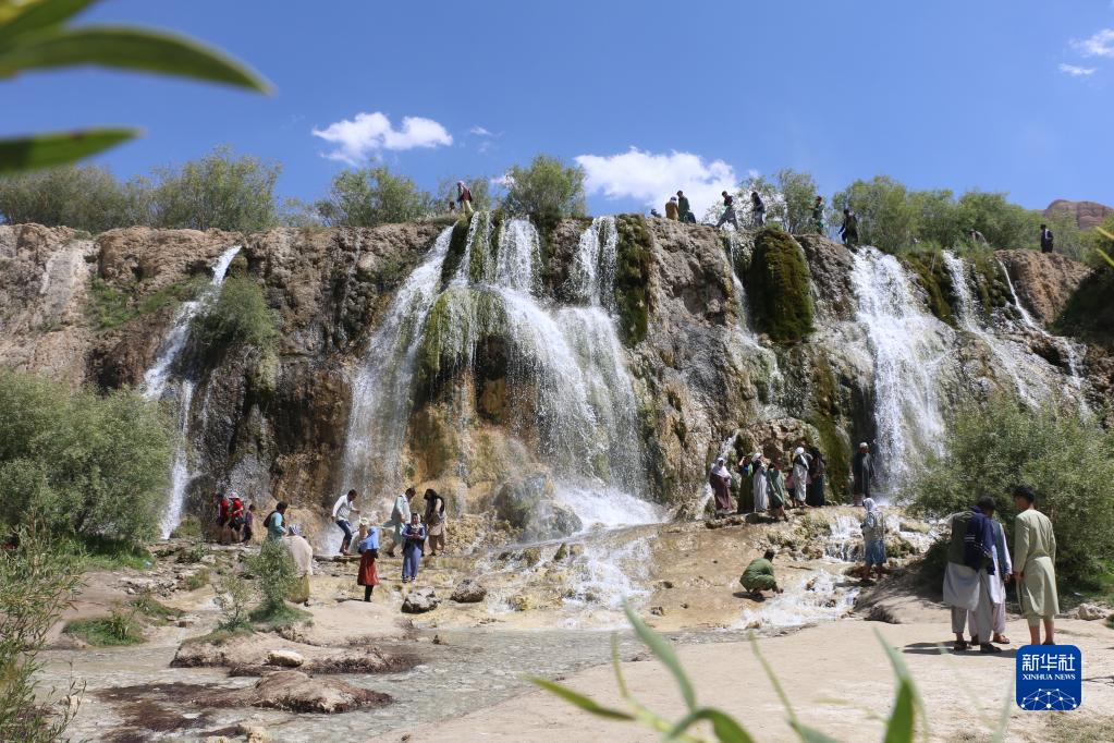 7月3日,游客在阿富汗巴米扬省班达米尔国家公园内游玩。