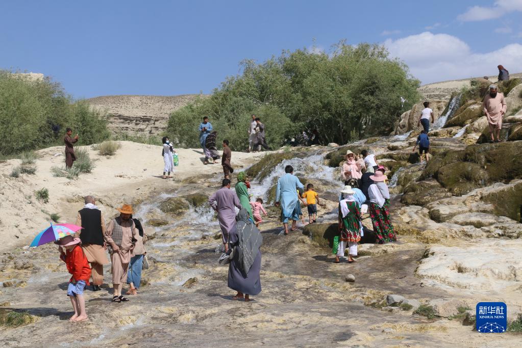 7月3日,游客在阿富汗巴米扬省班达米尔国家公园内游玩。