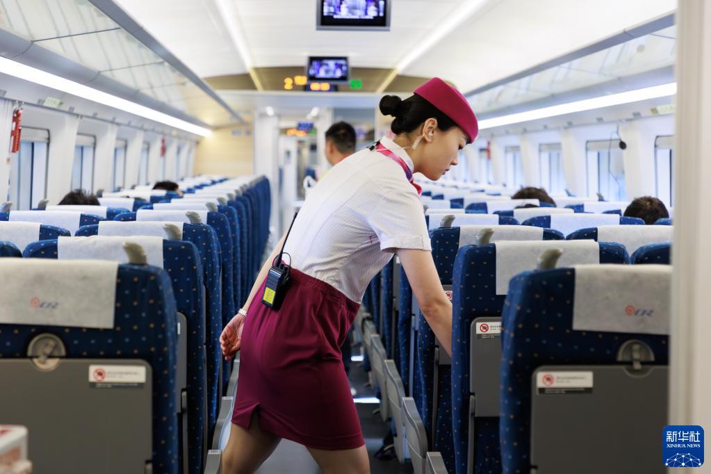 7月5日,在55301次试验列车上,乘务员整理车厢座椅。