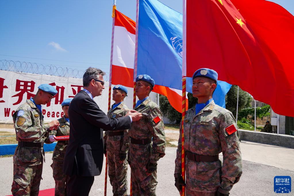 7月4日,在黎巴嫩南部地区辛尼亚村中国维和营,联合国驻黎巴嫩临时部队官员为中国维和官兵佩戴“和平荣誉勋章”。
