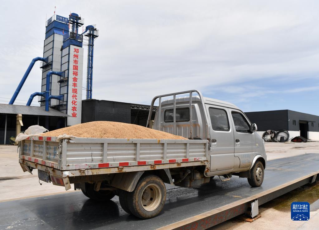 7月4日,在河南省邓州市国裕金丰种植专业合作社,一辆运粮货车在过磅。