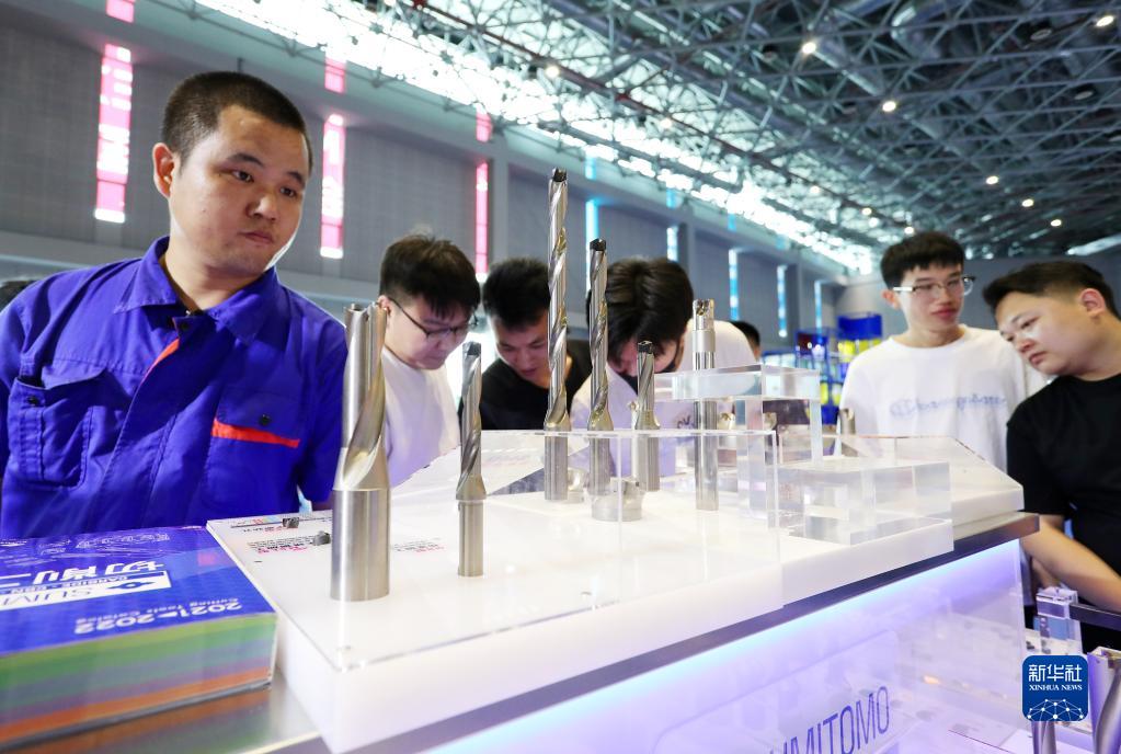 7月5日,参观者在一组多用途钻头展品前驻足观看。