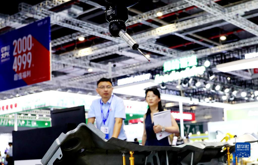 7月5日,参观者在一台进行作业演示的三坐标测量机前驻足观看。