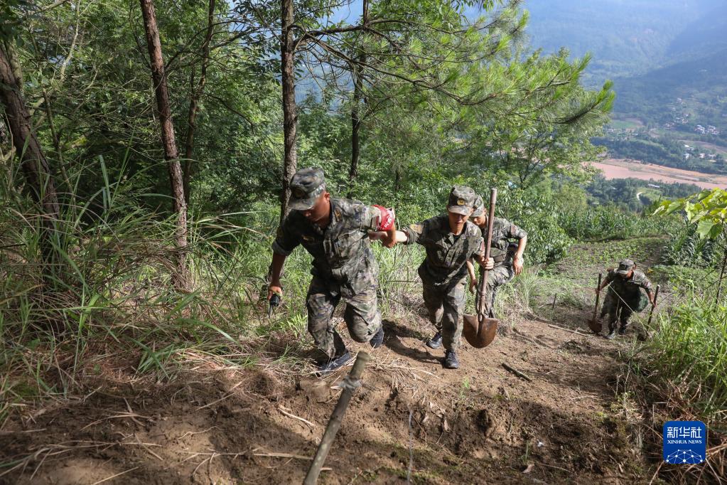 7月5日,在重庆市万州区长滩镇,武警官兵在受灾村庄摸排搜救。