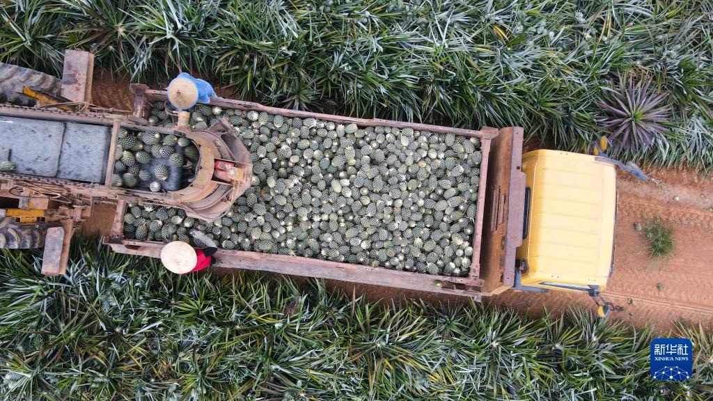 7月5日,在印度尼西亚楠榜省德邦易勿刹县一处菠萝种植园,人们将采摘下来的菠萝装车(无人机照片)。