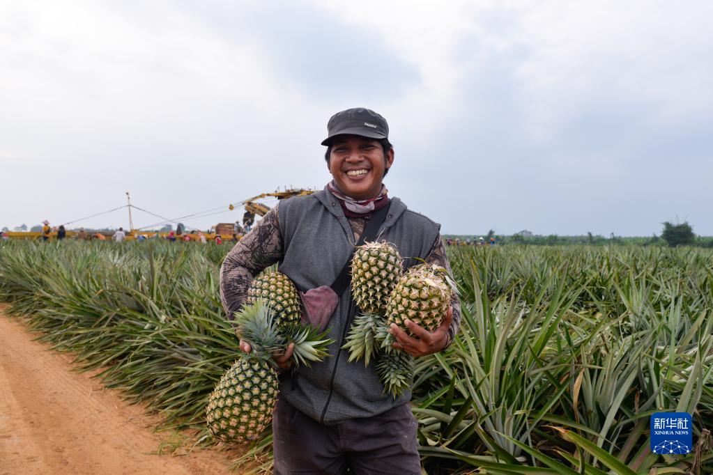 7月5日,在印度尼西亚楠榜省德邦易勿刹县一处菠萝种植园,一名采摘工人展示菠萝。