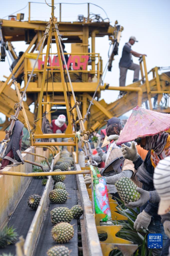 7月5日,在印度尼西亚楠榜省德邦易勿刹县一处菠萝种植园,人们在采摘菠萝。