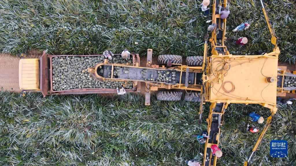 7月5日,在印度尼西亚楠榜省德邦易勿刹县一处菠萝种植园,人们将采摘下来的菠萝装车(无人机照片)。