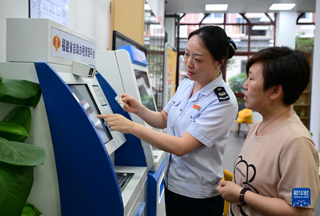 7月5日,在福州市台江区苍霞新城社区嘉和苑“税银人家”,居民唐秋冰(右)在通过驿站里的“福建省自助办税管理平台”综合一体机查询打印个人所得税纳税记录。