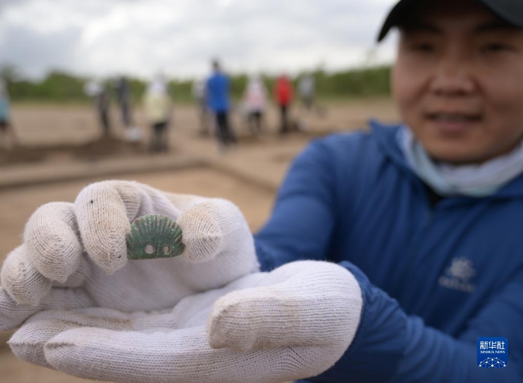 7月5日,考古队工作人员展示一件在遗址现场采集的文物。