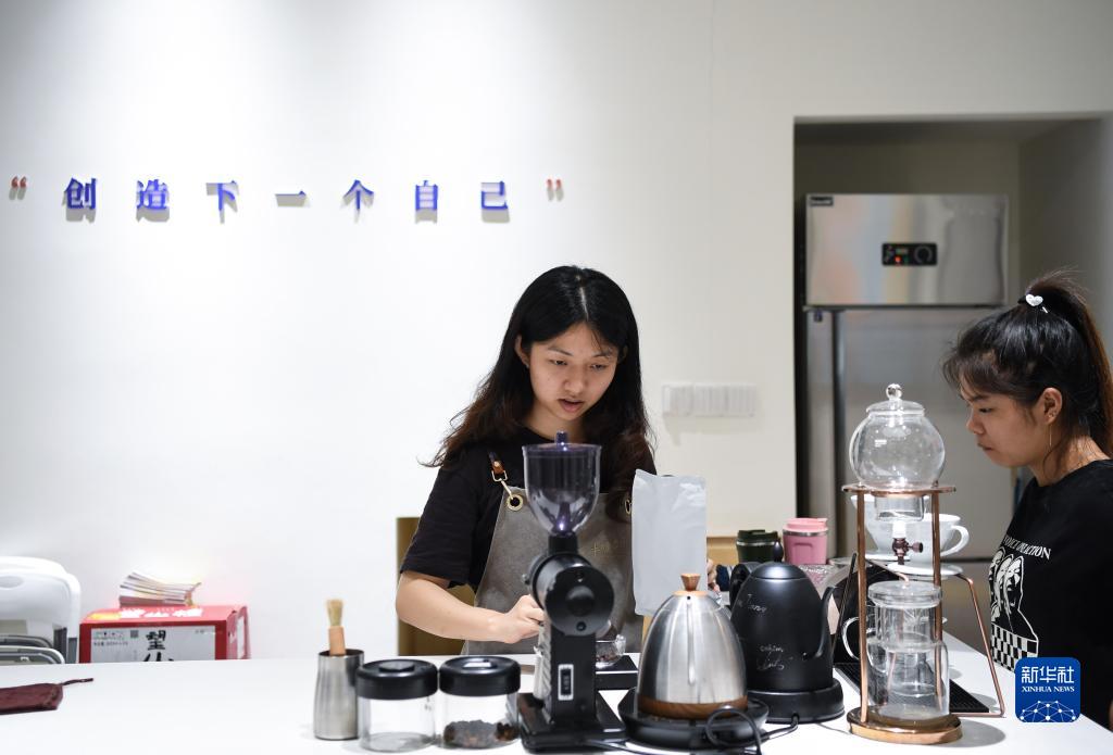 7月5日,在广州市白云区的手心咖啡店,视障咖啡师陈柳晓(左)在制作咖啡。