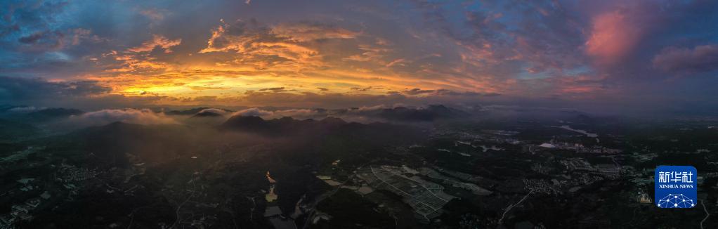 7月5日拍摄的晚霞笼罩下的浙江省建德市大慈岩镇(无人机照片)。