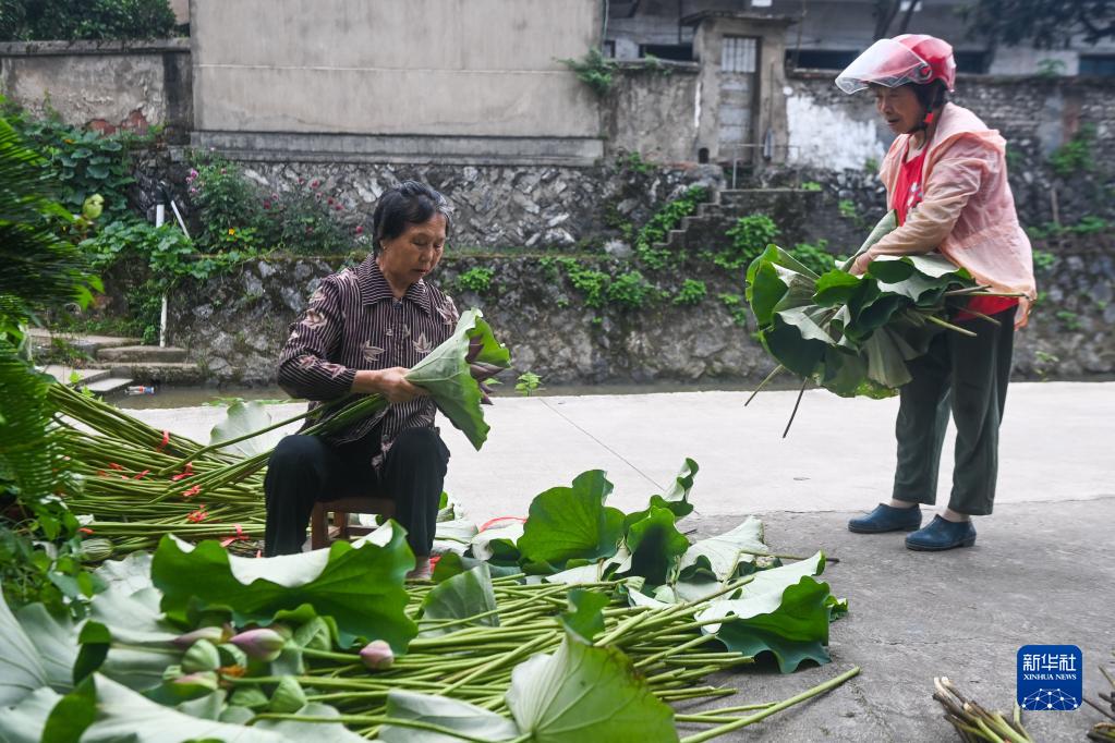 7月6日清晨,浙江省建德市大慈岩镇里叶村村民在分类打包刚采摘的荷花和莲蓬。这些荷花和莲蓬分类包装后,将快速运往江浙沪的花卉市场。
