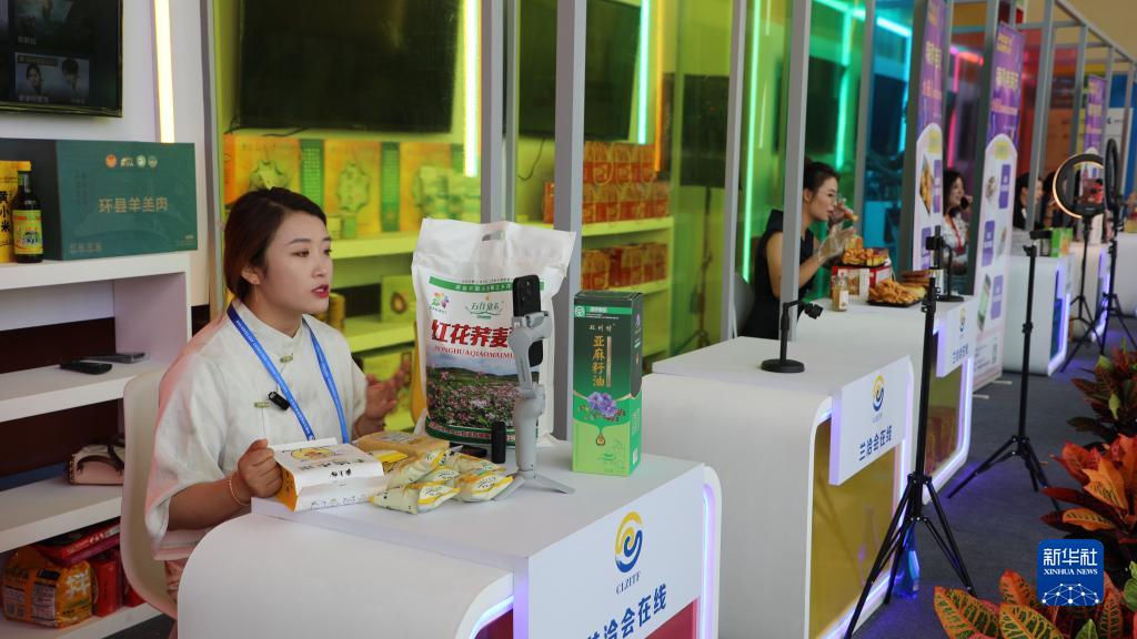 7月6日,电商直播工作人员在第二十九届中国兰州投资贸易洽谈会上进行直播销售。