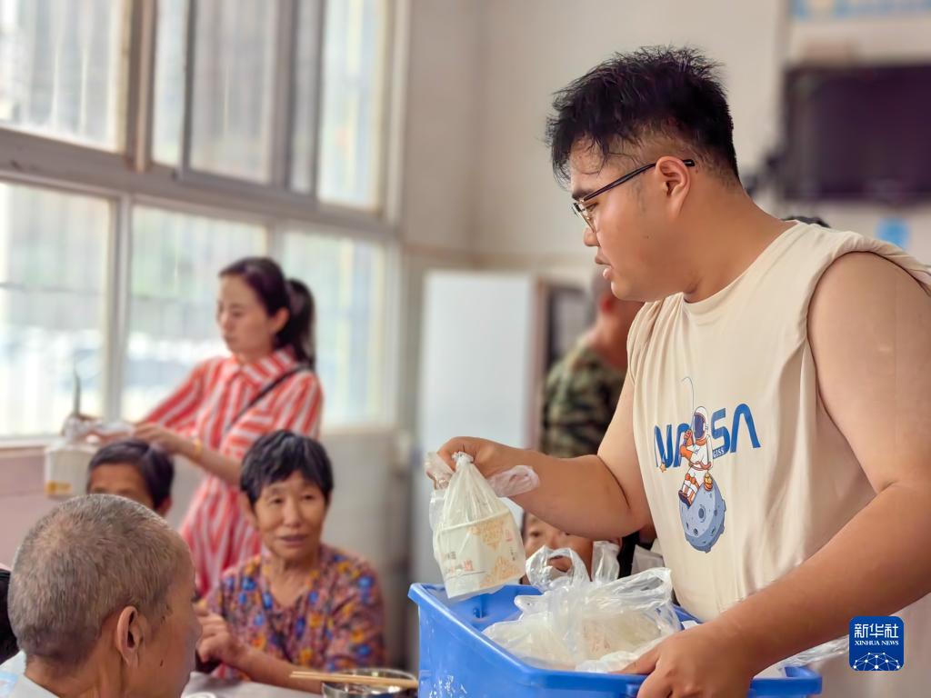 7月6日,志愿者在位于重庆市万州区长滩初级中学的临时安置点发放餐食。