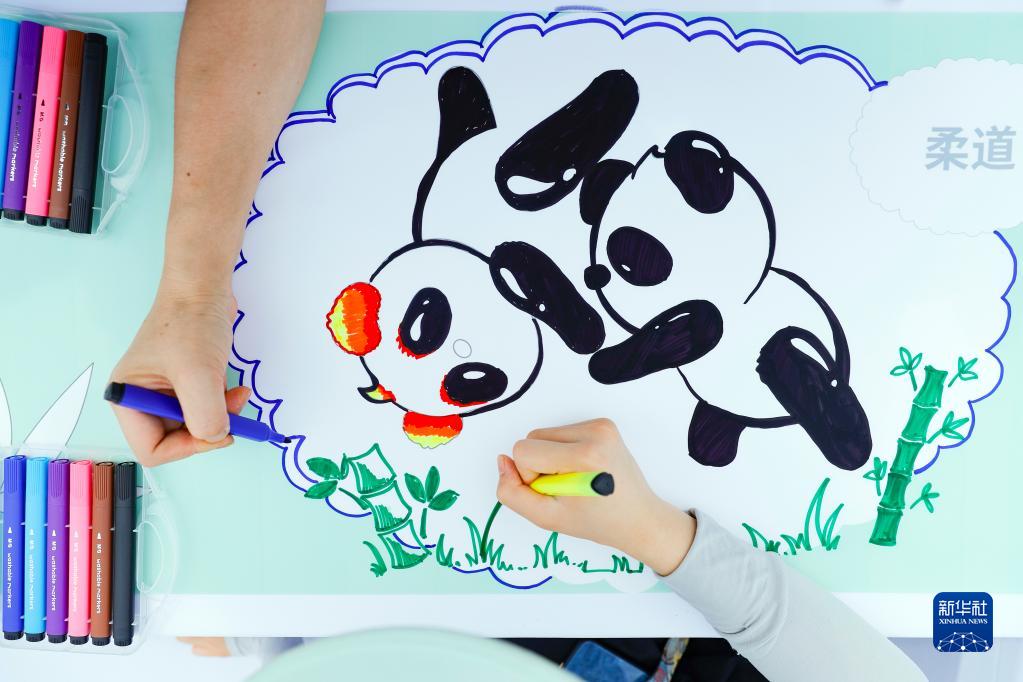 7月6日,一名孩子与家长一起在大运会主题长卷上绘制展现柔道比赛内容的熊猫造型图案。