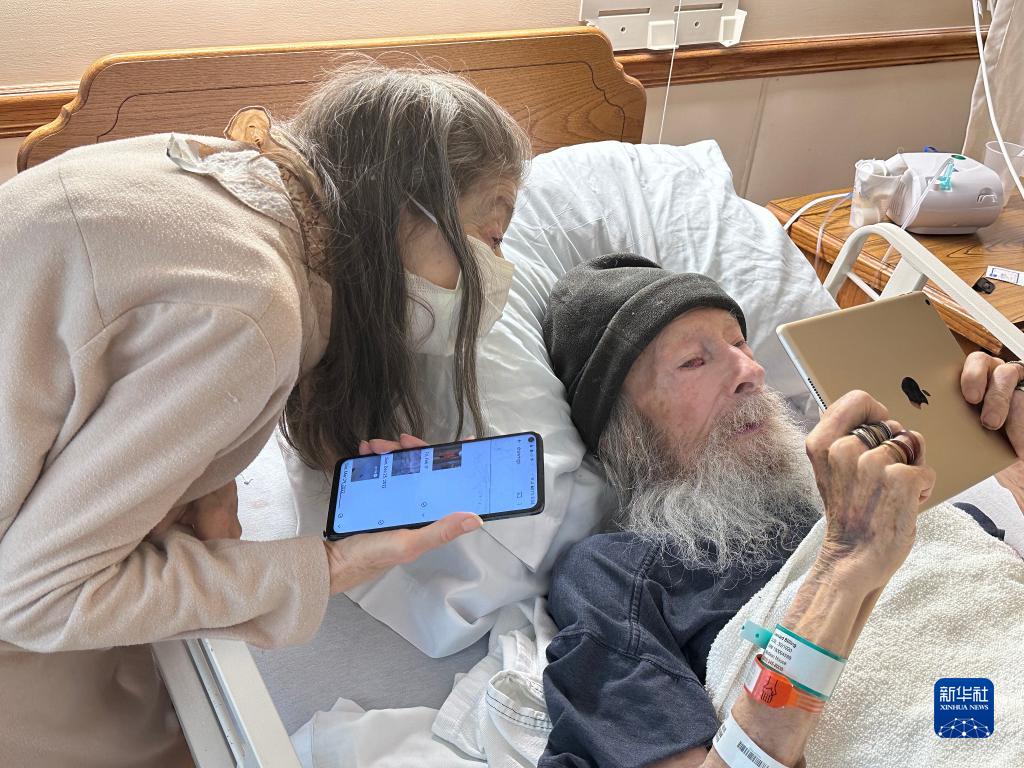 7月2日,103岁的美国老人林恩·柏龄(右)在其家附近的康养中心病床上,以视频连线的方式“重回”了他魂牵梦绕87年的鼓岭。新华社记者 杨士龙 摄