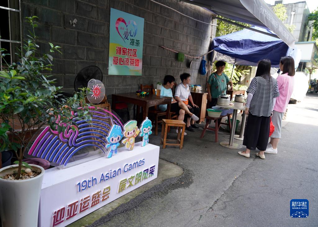 这是7月7日拍摄的杭州市濮家联合社区爱心凉茶摊和一旁的迎亚运景观小品。