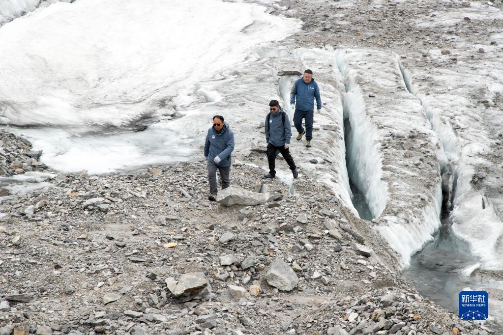 玉龙雪山站站长王世金(左)和团队成员马兴刚(中)、燕兴国携带监测设备在玉龙雪山白水河1号冰川上行进(6月19日摄)。