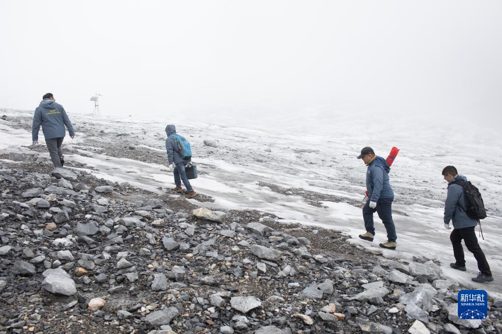 玉龙雪山站站长王世金(左一)带领团队成员携带监测设备在白水河1号冰川上前行(6月19日摄)。