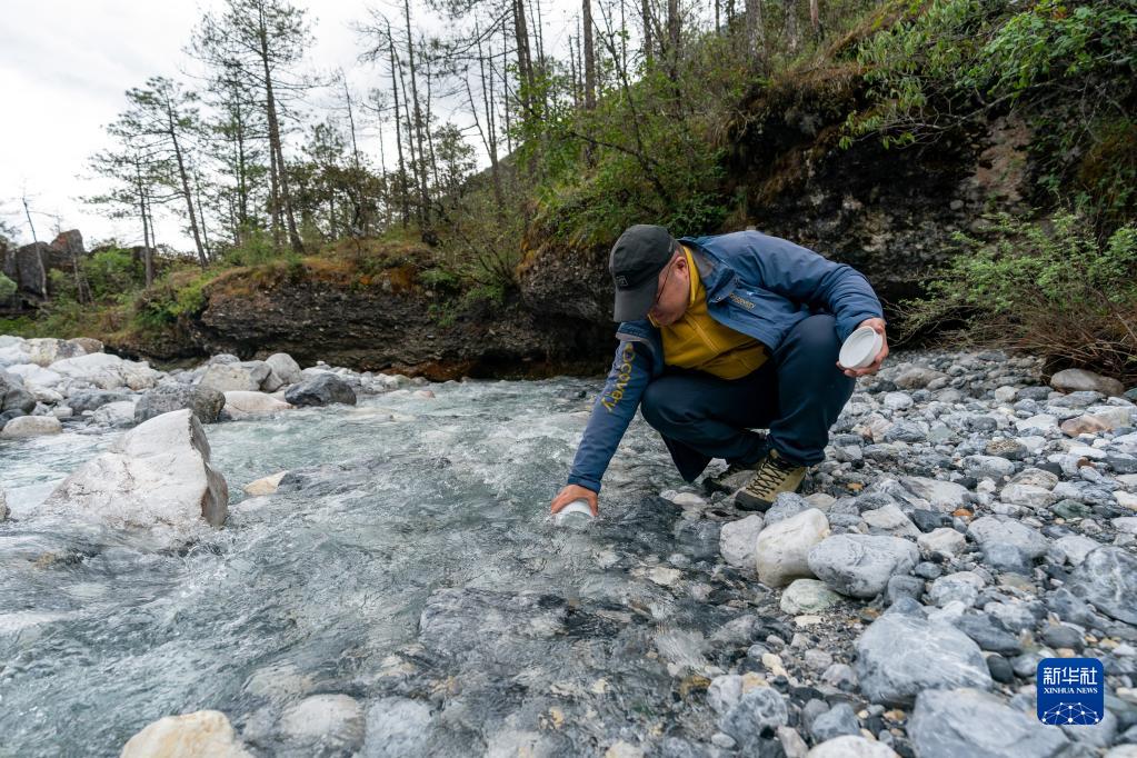 玉龙雪山站工作人员燕兴国在白水河水文观测点取水样(6月16日摄)。