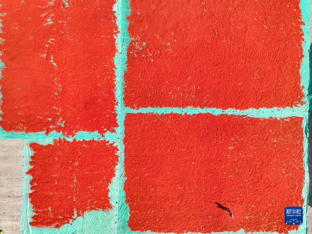 7月7日,新疆裕民县江格斯乡的村民在晾晒红花丝(无人机照片)。
