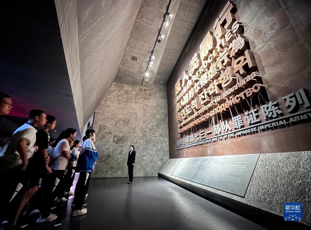 7月7日,在侵华日军第七三一部队罪证陈列馆,参观者参观用六种语言写的“反人类暴行”墙。