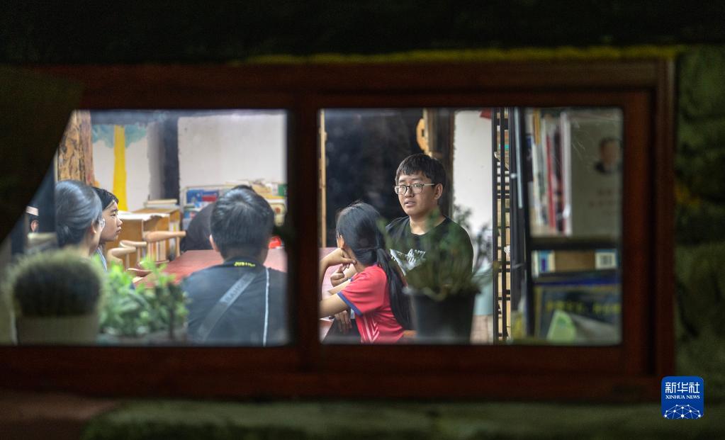 7月5日晚,甘文勇(右一)在“半山花语”书屋组织读书活动。新华社记者 费茂华 摄