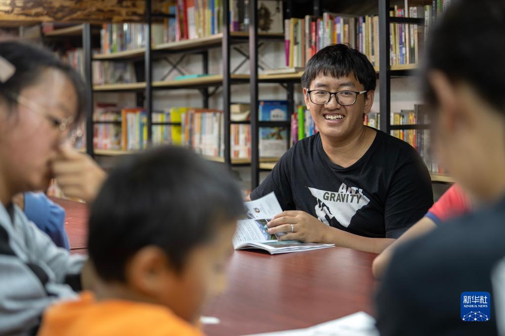 7月5日晚,甘文勇(左三)在“半山花语”书屋组织读书活动。新华社记者 费茂华 摄