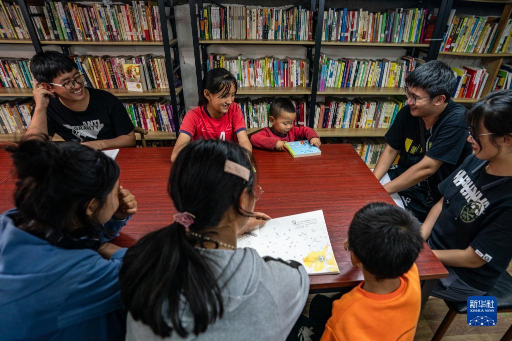 7月5日,甘文勇(左上)在“半山花语”书屋与孩子们一起参加读书活动。新华社记者 江文耀 摄