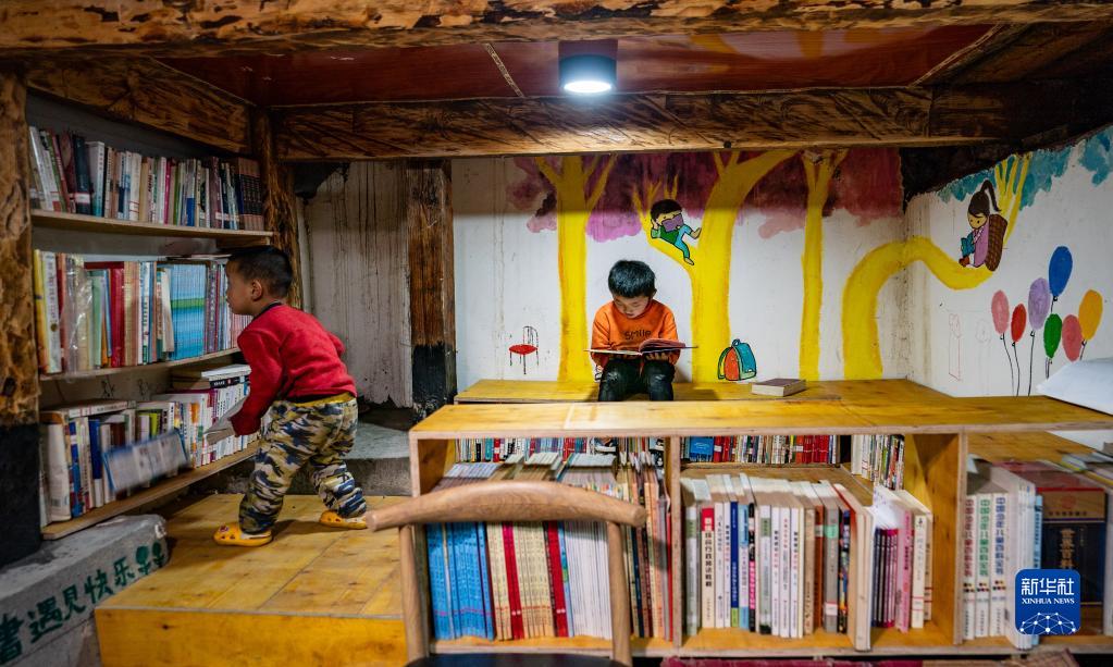 7月5日,秋那桶村的小朋友们在“半山花语”书屋选书、读书。新华社记者 江文耀 摄