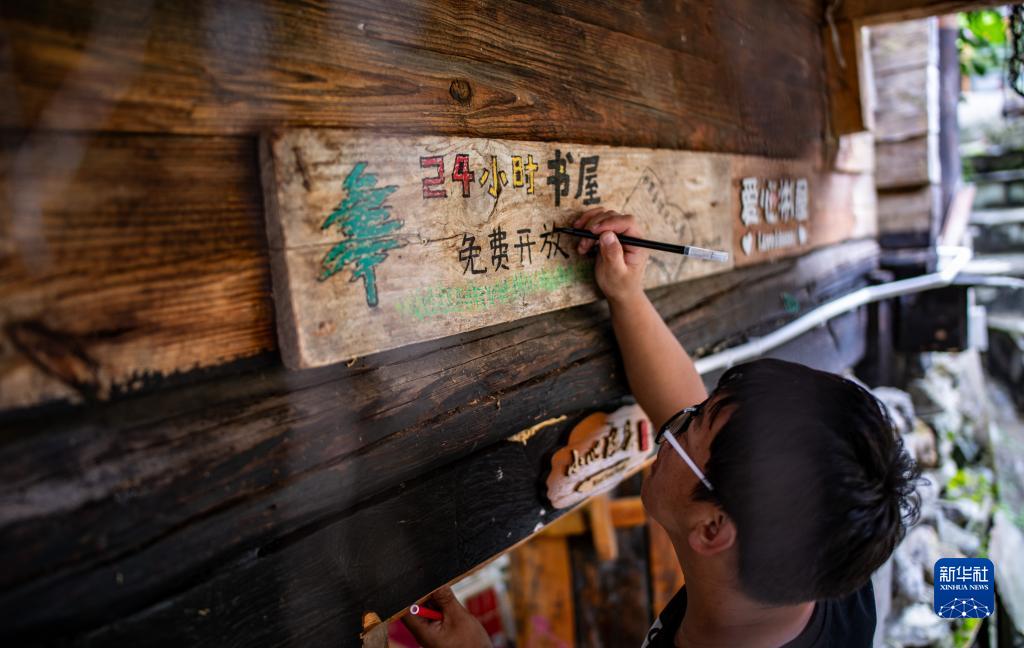 7月6日,甘文勇在修缮书屋的木牌。新华社记者 江文耀 摄