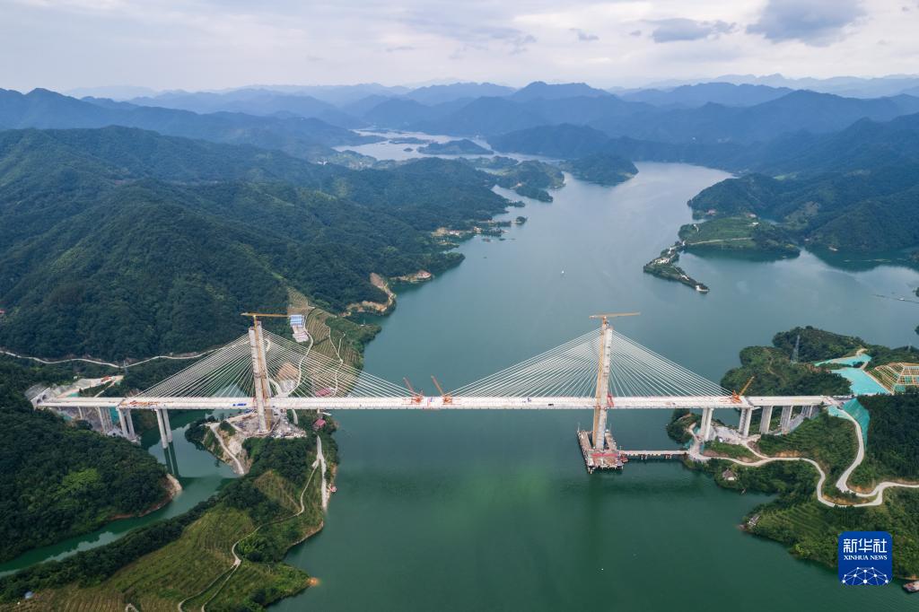 这是7月7日在湖南省益阳市安化县拍摄的官新高速雪峰湖大桥施工现场(无人机照片)。