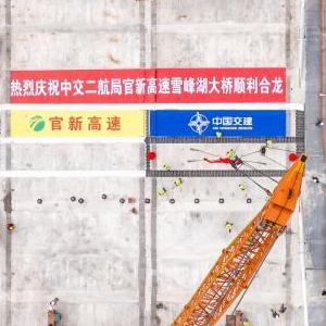 当日,由湖南高速集团投资,中交二航局承建的湖南官(庄)新(化)高速全线重点控制性工程雪峰湖大桥顺利合龙,为早日通车运行奠定了基础。雪峰湖大桥位于湖南省益阳市安化县境内,全长1187米,为主跨500米的双塔双索面半漂浮体系斜拉桥。
