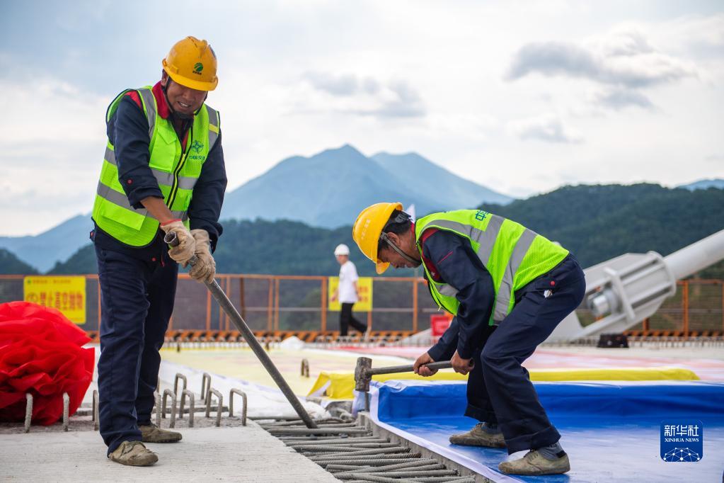 7月7日,在官新高速雪峰湖大桥施工现场,工人在进行桥面合龙施工。
