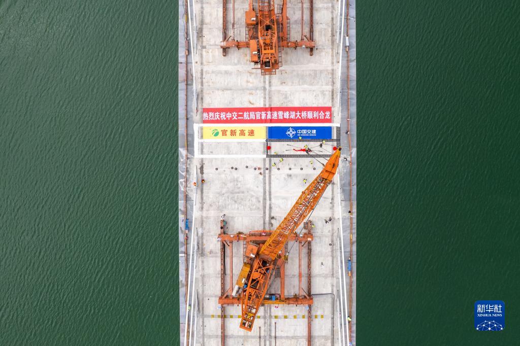 当日,由湖南高速集团投资,中交二航局承建的湖南官(庄)新(化)高速全线重点控制性工程雪峰湖大桥顺利合龙,为早日通车运行奠定了基础。雪峰湖大桥位于湖南省益阳市安化县境内,全长1187米,为主跨500米的双塔双索面半漂浮体系斜拉桥。