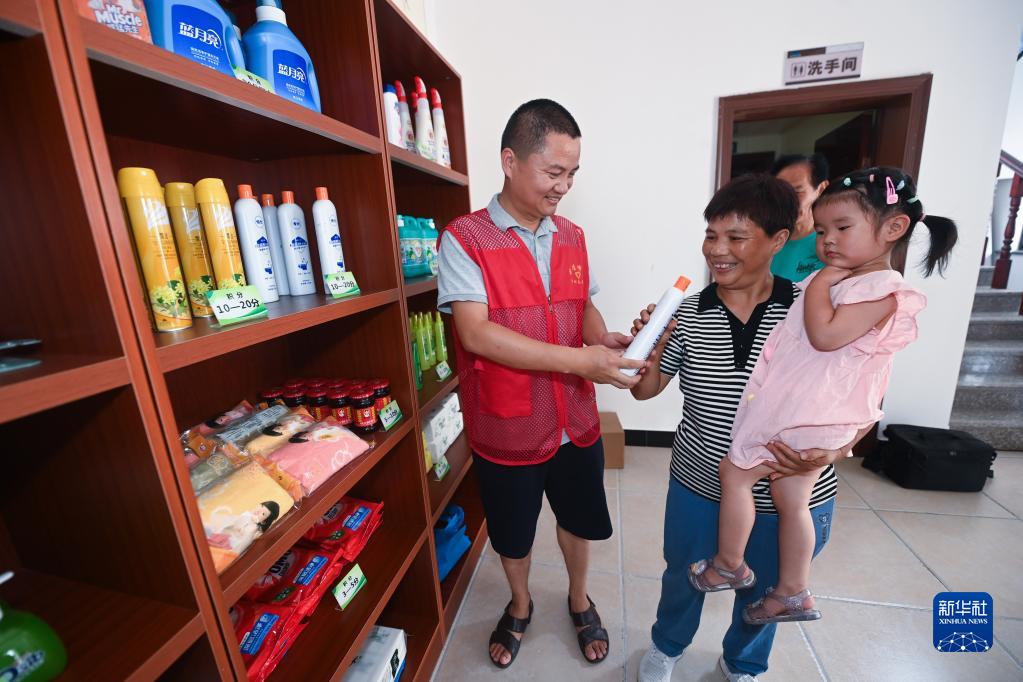 7月7日,在杭州市临安区清凉峰镇颊口村文化礼堂的“家风银行”积分超市,党员志愿者在给村民兑换礼品。