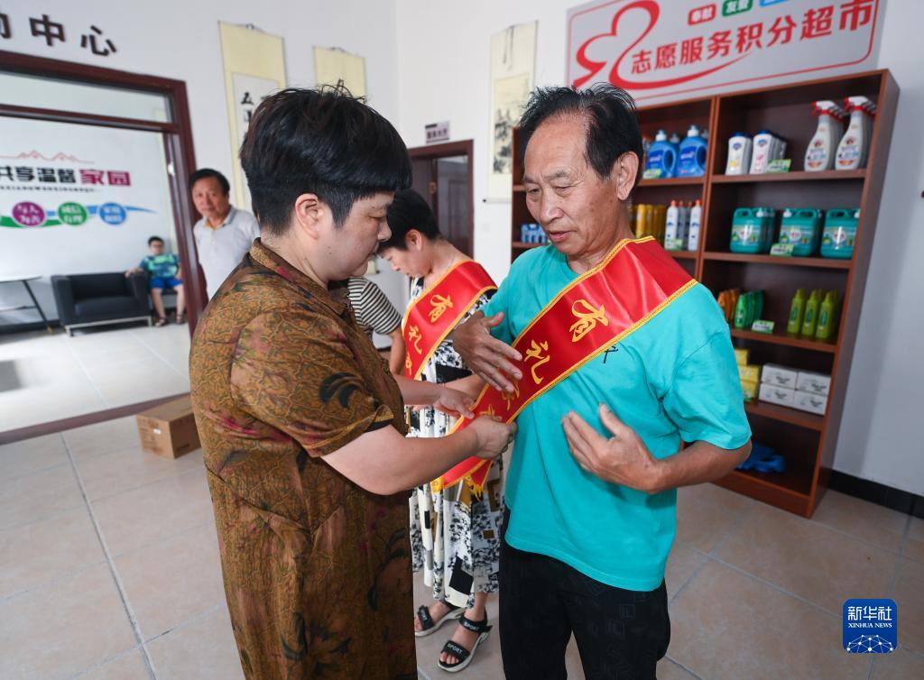 7月7日,在杭州市临安区清凉峰镇颊口村文化礼堂的“家风银行”积分超市,村干部在给上季度德善积分排名前五的村民颁奖。