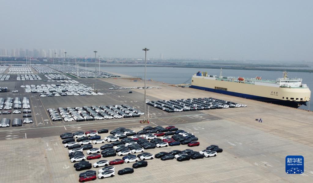 7月7日,一艘滚装船停靠在天津港环球滚装码头(无人机照片)。