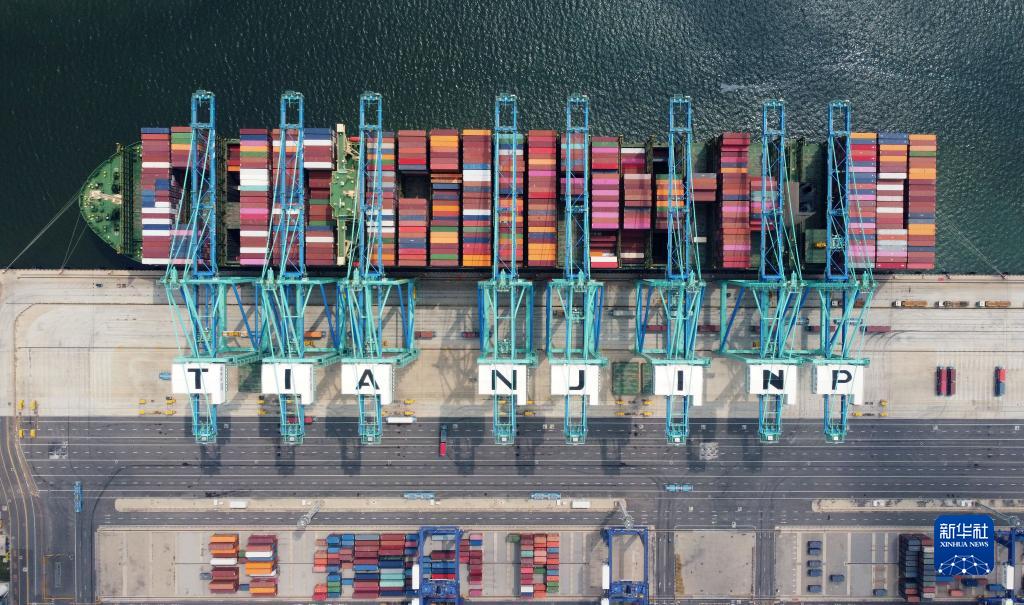 7月7日,一艘货轮停靠在天津港“智慧零碳”码头(无人机照片)。