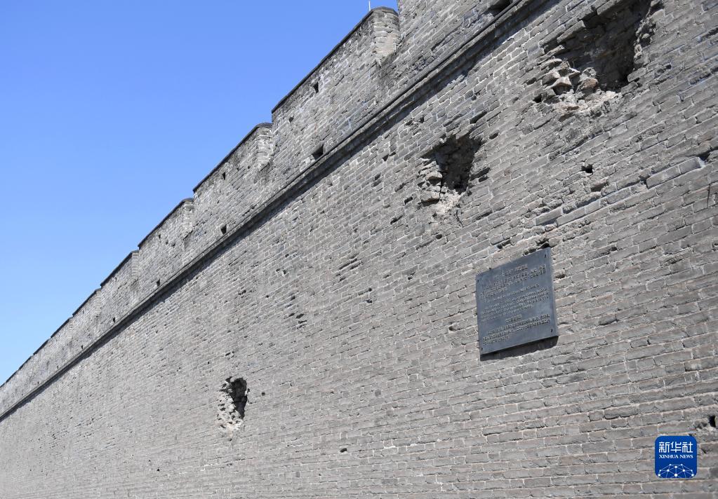 这是7月6日拍摄的宛平城城墙上的“七七事变”弹坑遗址。